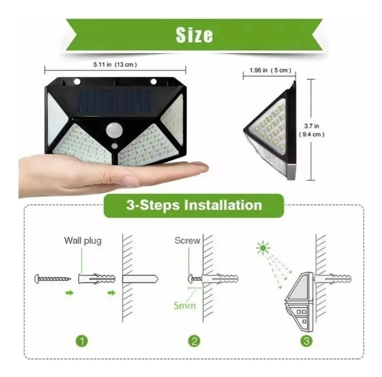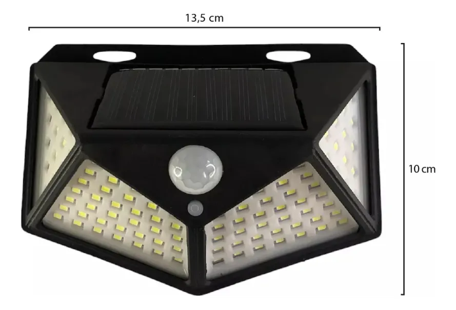 El modelo 100LED cuenta con un sensor de movimiento que activa la luz al detectar movimiento, proporcionando un encendido automático que maximiza la eficiencia energética. Con un alcance de hasta 10 metros y dimensiones compactas de 13.5 cm de ancho, 6.5 cm de profundidad y un peso ligero de 190 g, es fácil de montar en diversas ubicaciones. La tecnología LED no solo asegura una larga vida útil, sino que también reduce el consumo de energía.