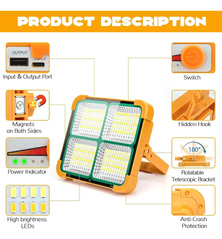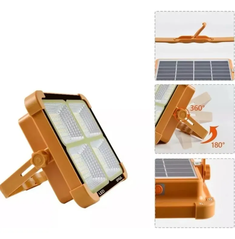 Luz de trabajo solar impermeable IP66: la luz LED portátil impermeable para acampar con clasificación impermeable IP66 soporta el uso en días lluviosos.